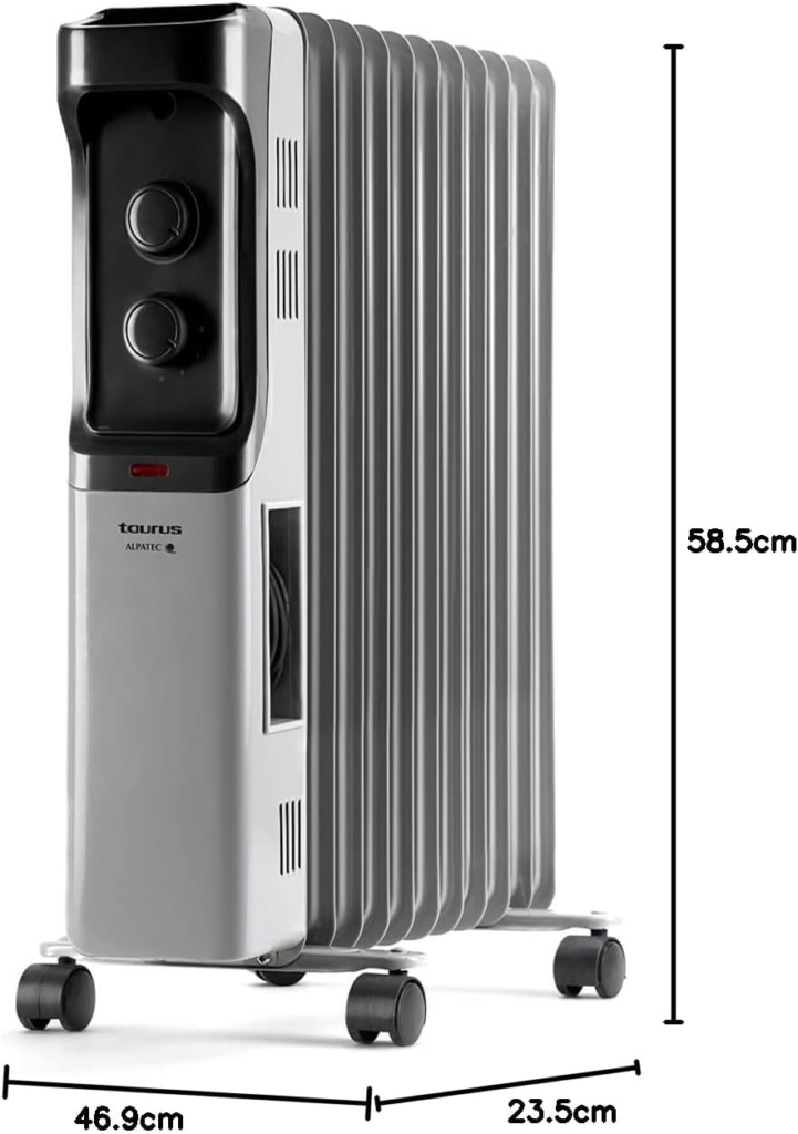 Radiador de aceite de 11 elementos, 2500W, 3 niveles de potencia, Termostato ajustable, Protección sobrecalentamiento, Asa y ruedas, Bajo consumo, Piloto luminoso, Gris [Clase de eficiencia energética A] —> COMPRAR EN AMAZON